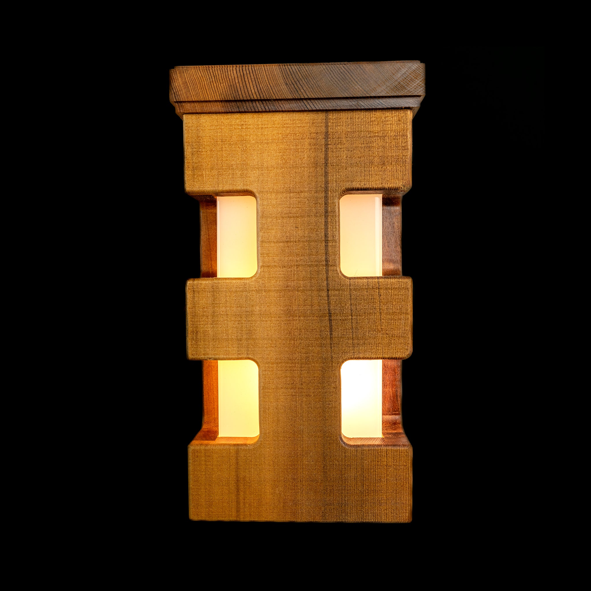 The 334 - 10” Sconce emits light on four sides, each of which is also bisected by a wooden cross. It is wet location rated and certified to UL Standard 1598.
